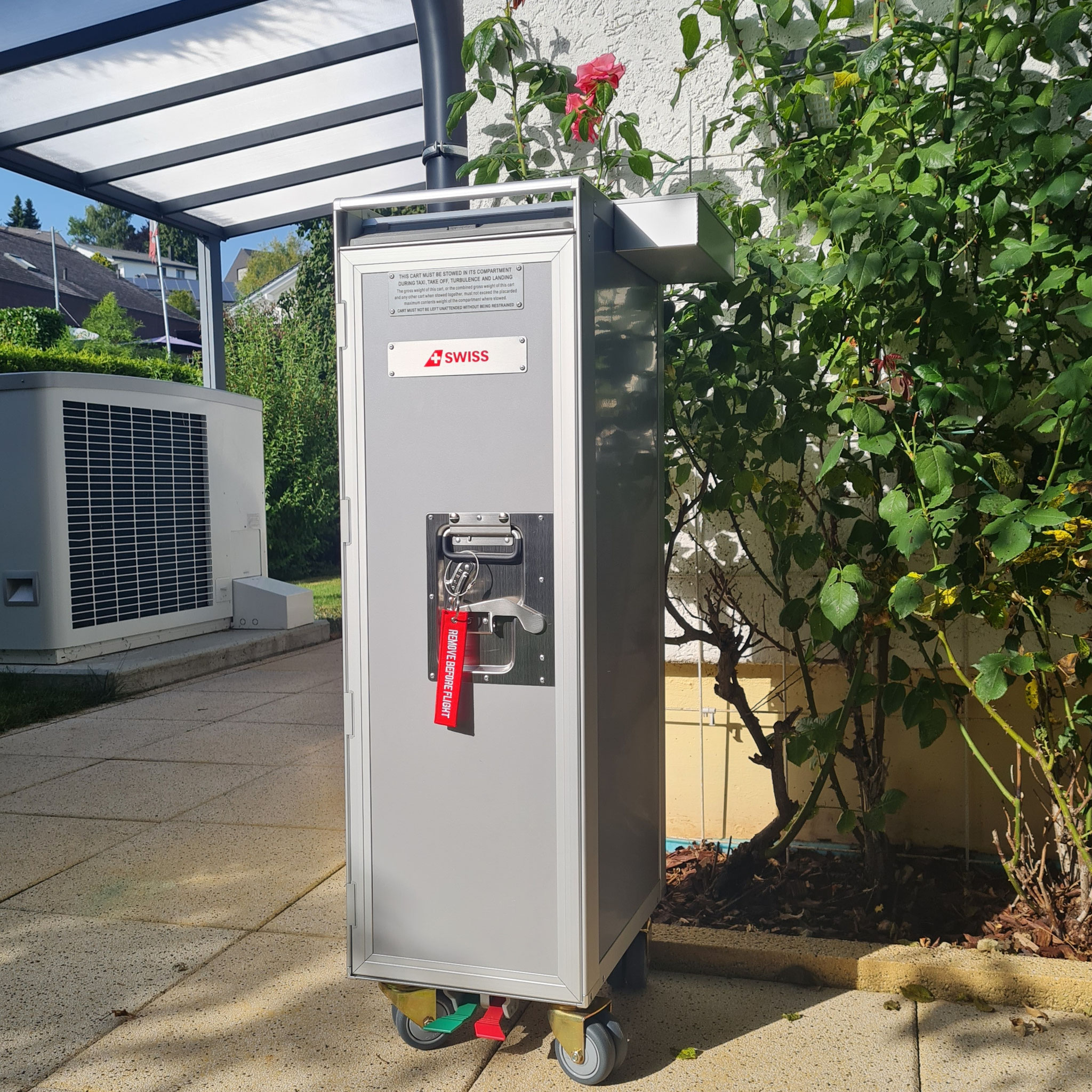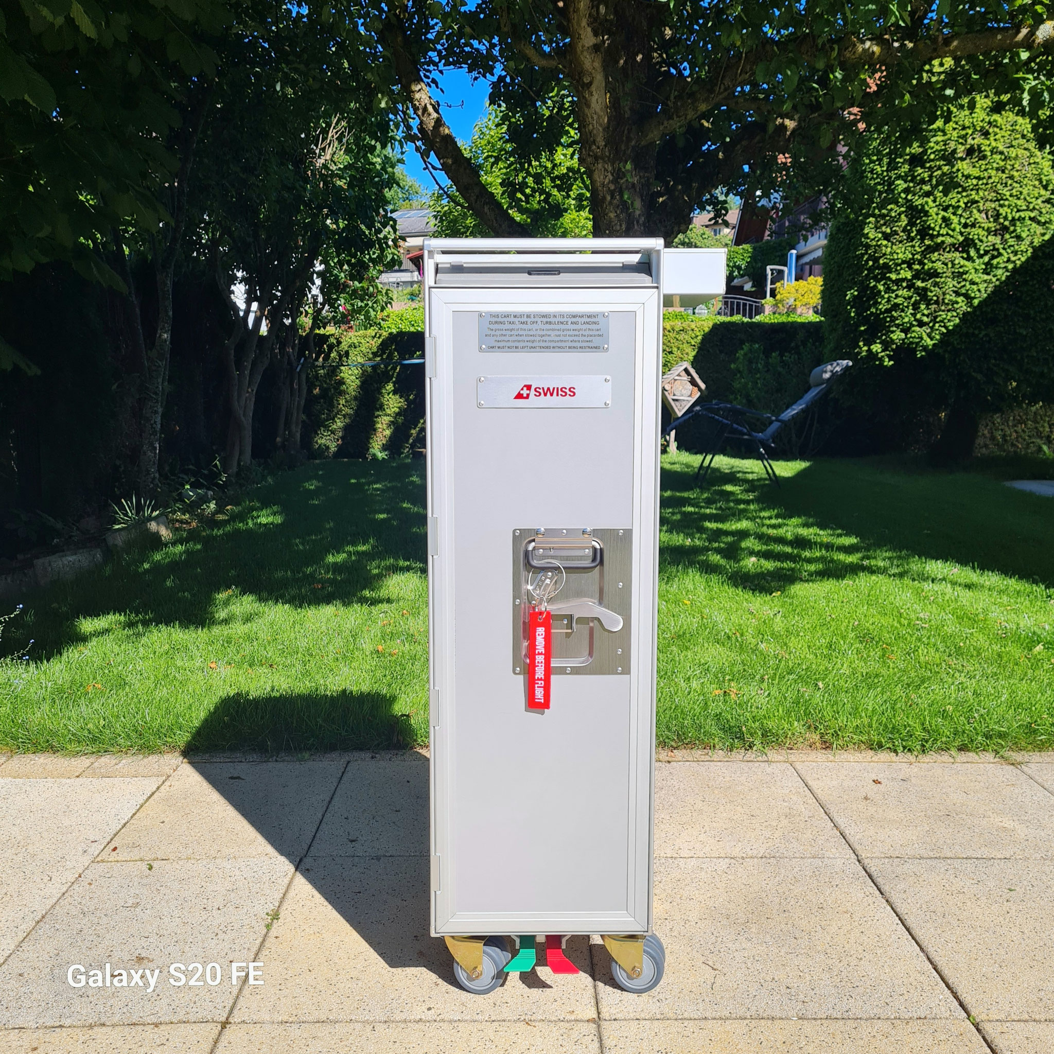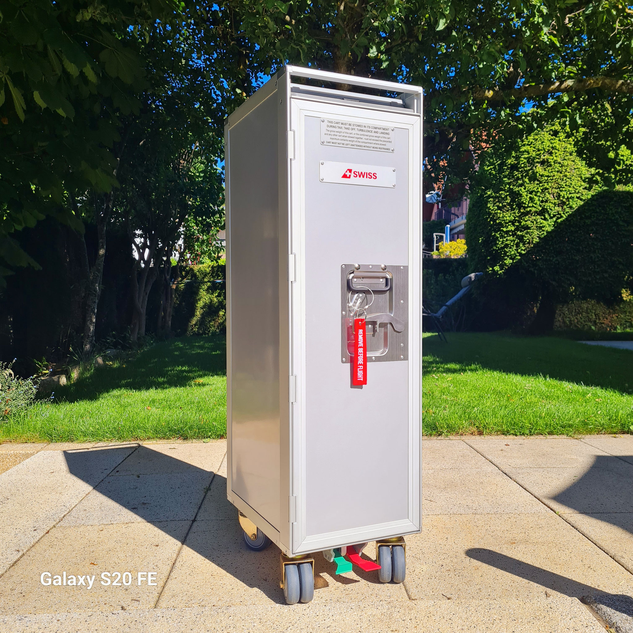 Wir haben diesen neuen Flugzeugtrolley in edlem Silbergrau (RAL 7001) mit Stow- and Secure-Aviatikschild und vielgeflogenem, top erhaltenem Originalschild der Swiss veredelt (Swiss International Air Lines).