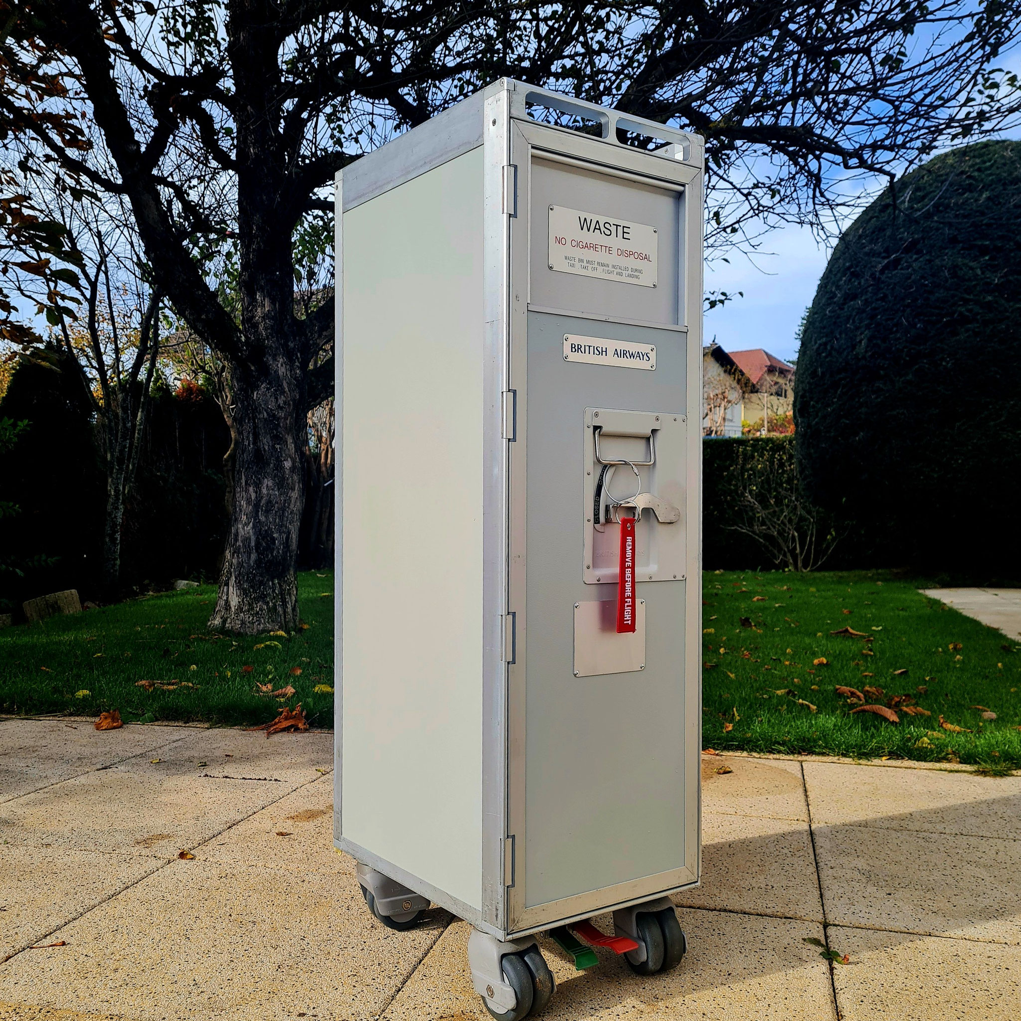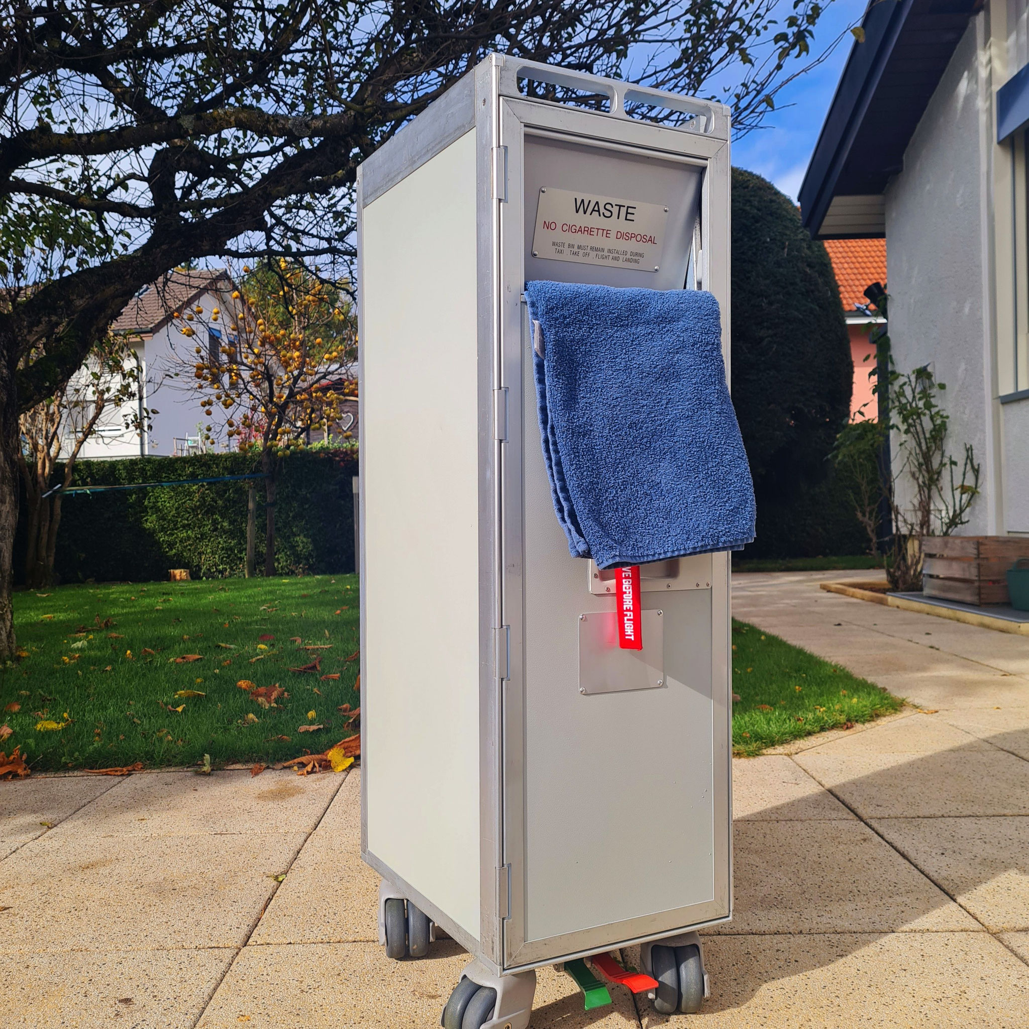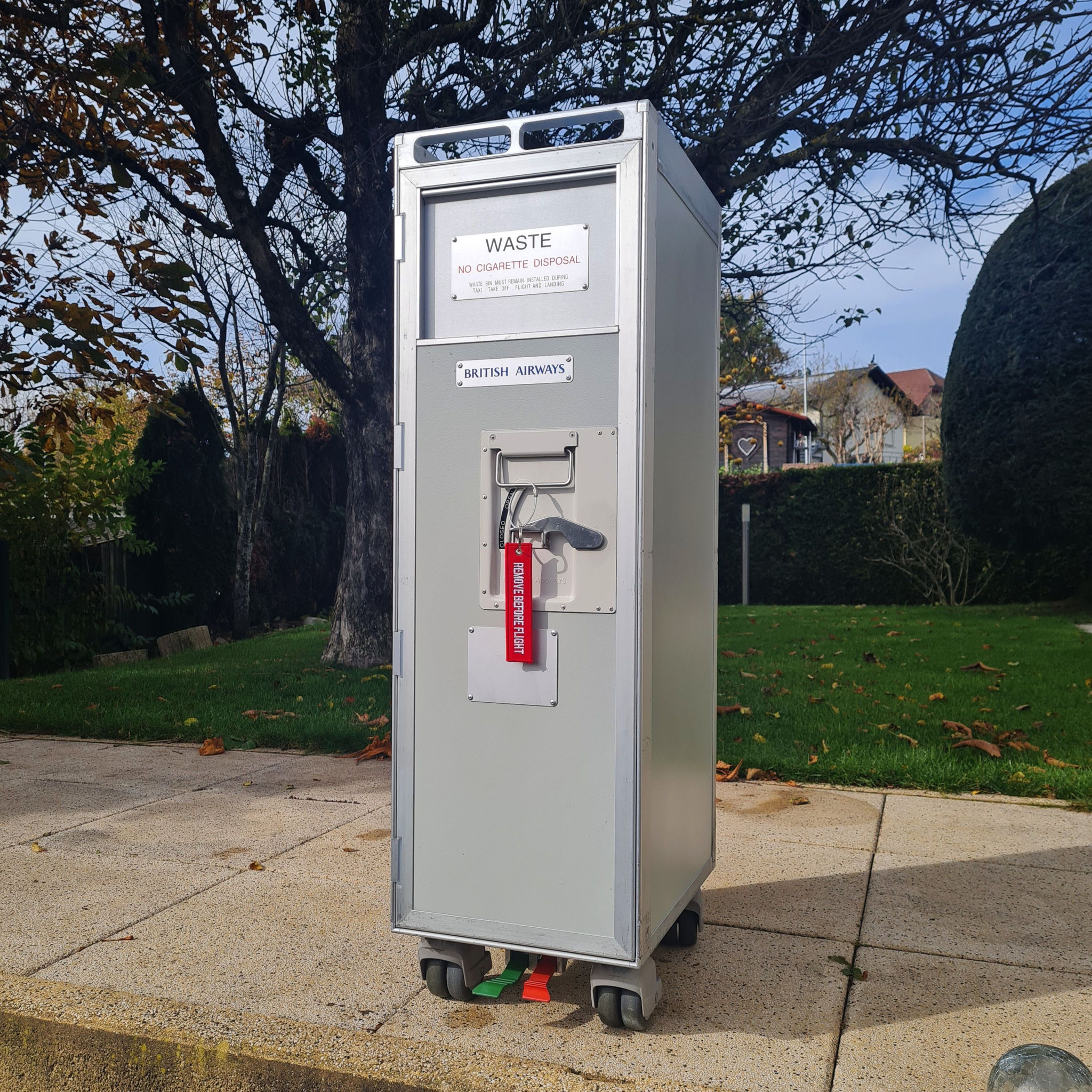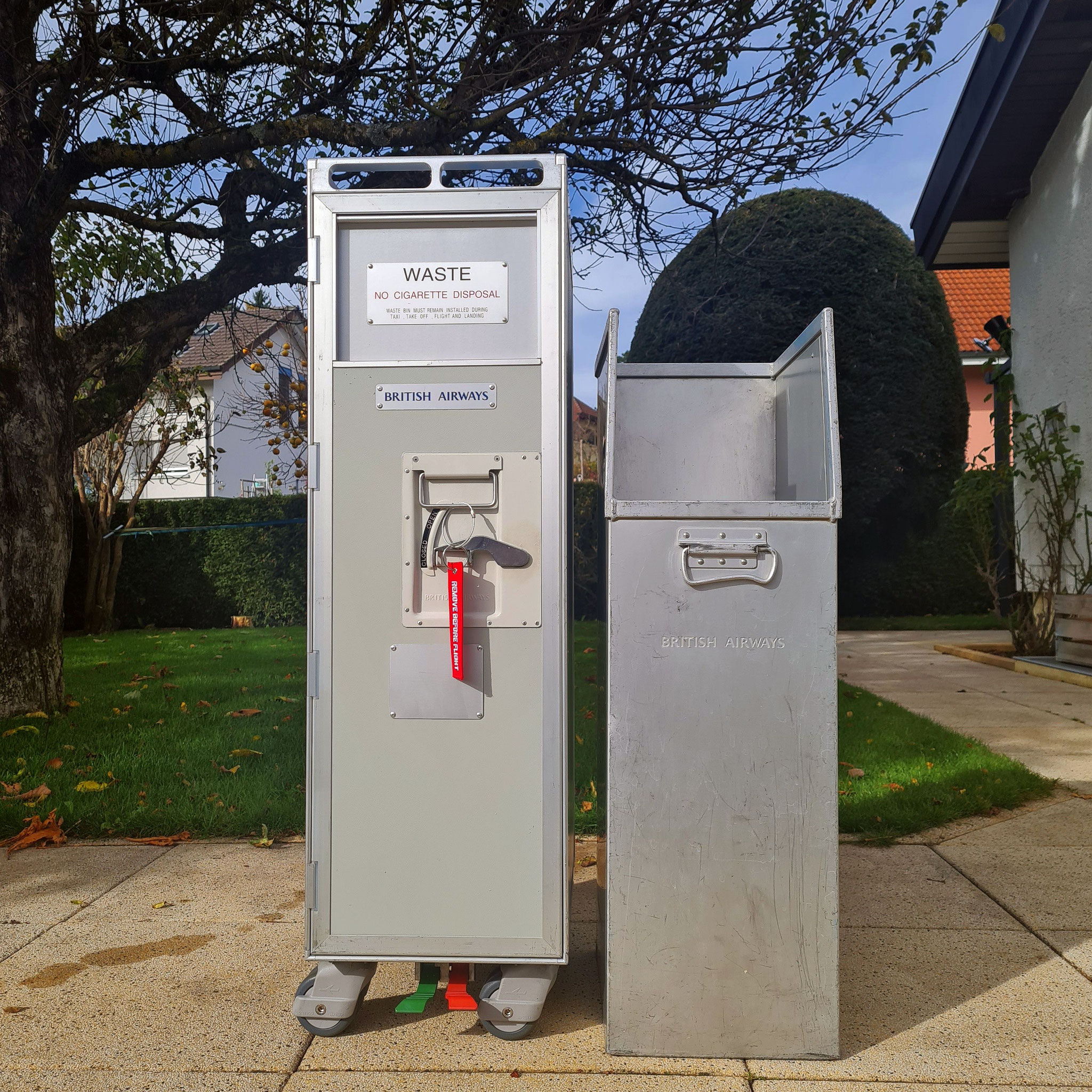 Wir bieten diesen toll erhaltenen Waste-Trolley in hellem Achatgrau an (RAL-Farbpalette 7038), der 2019 produziert worden ist und seither für British Airways unzählige Male um die Welt geflogen