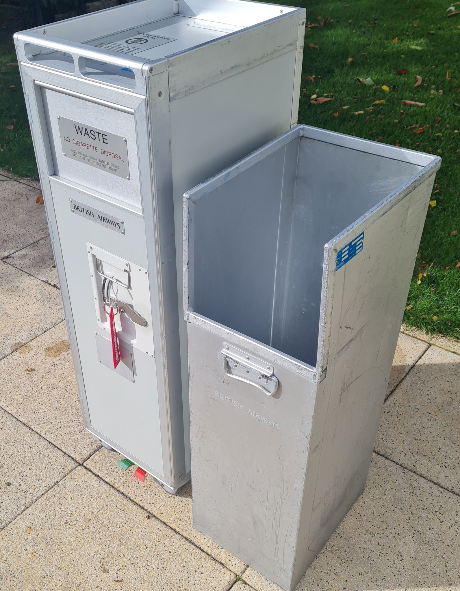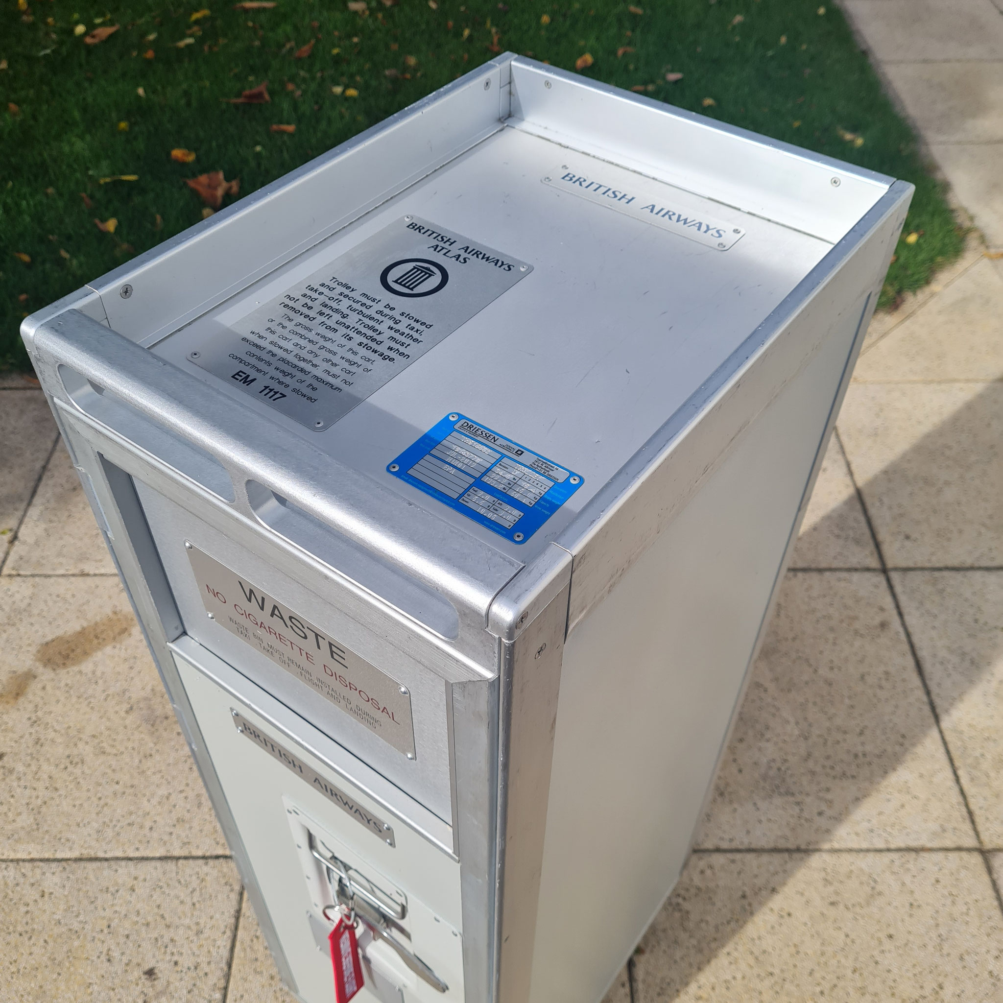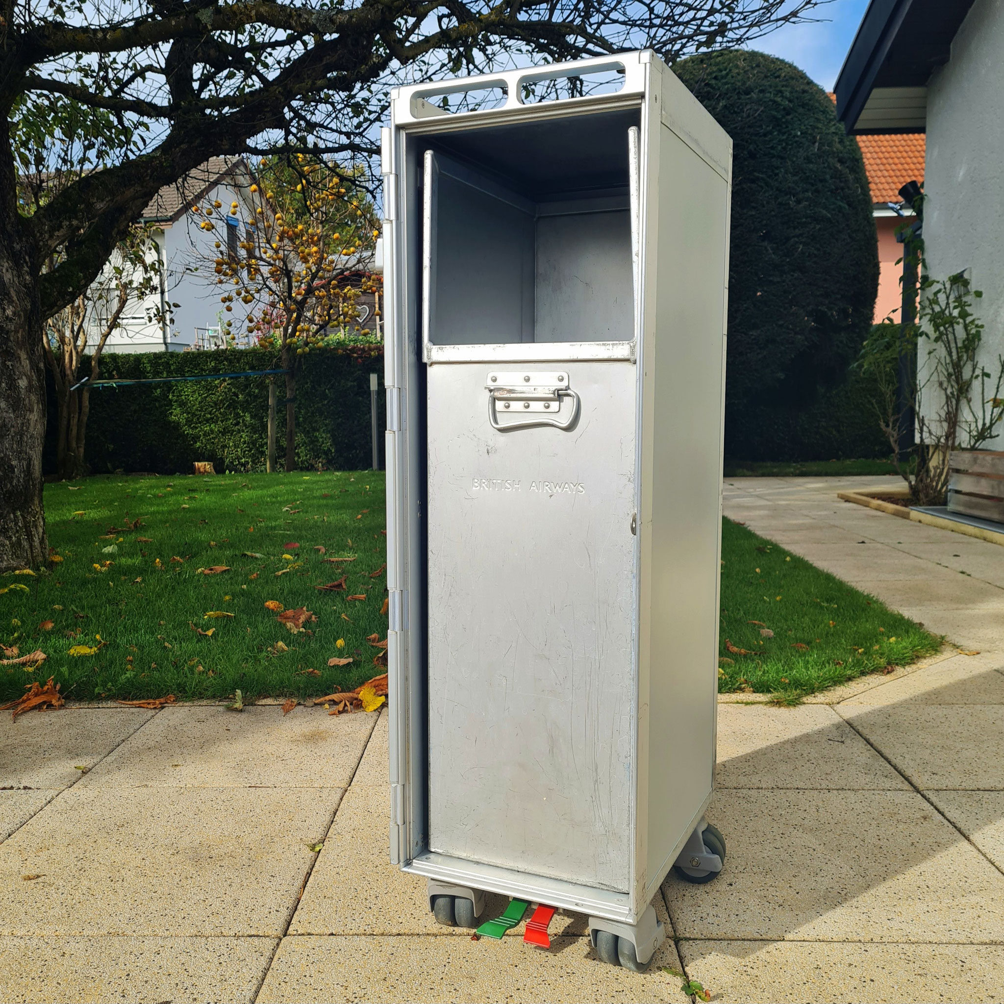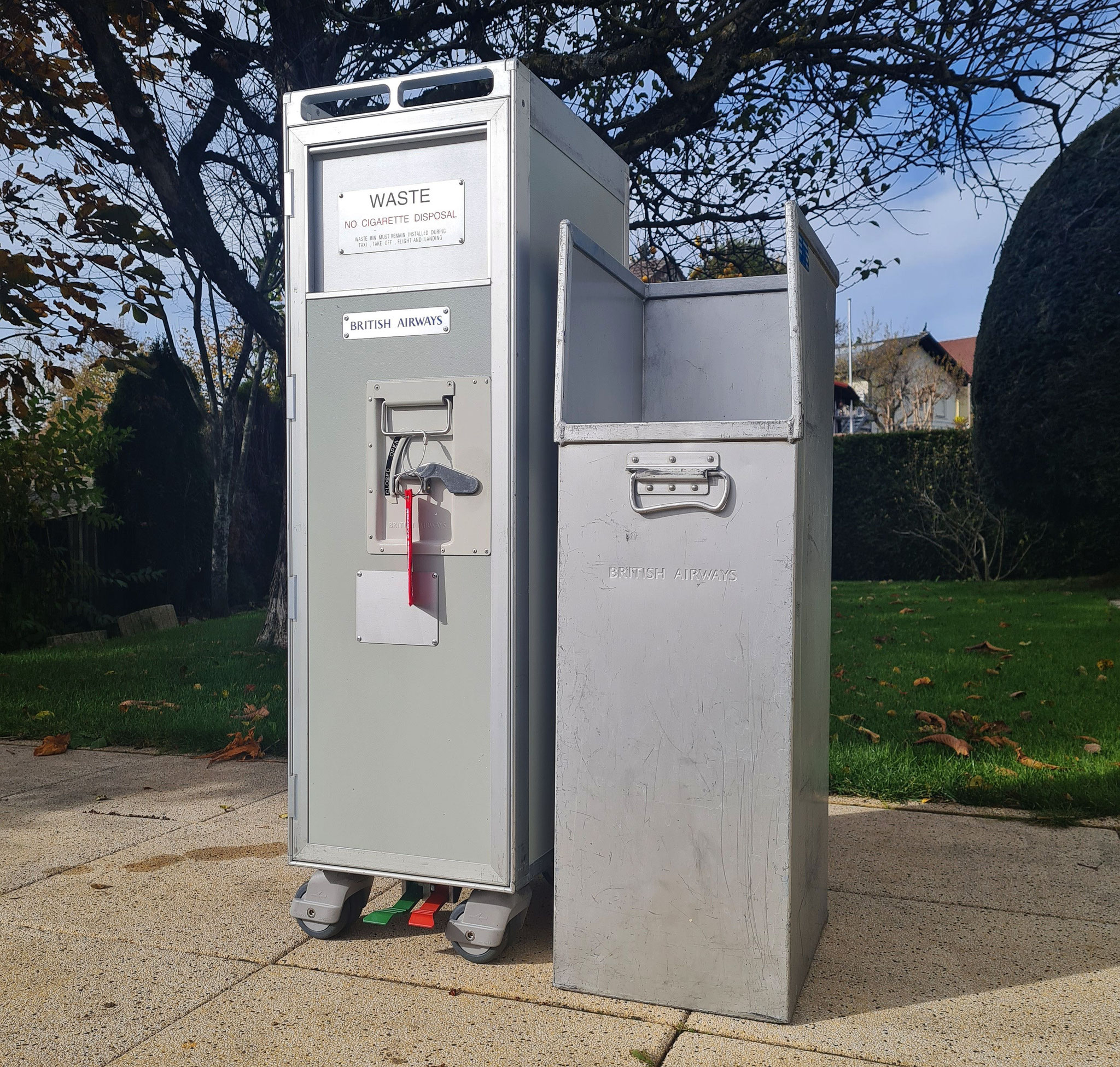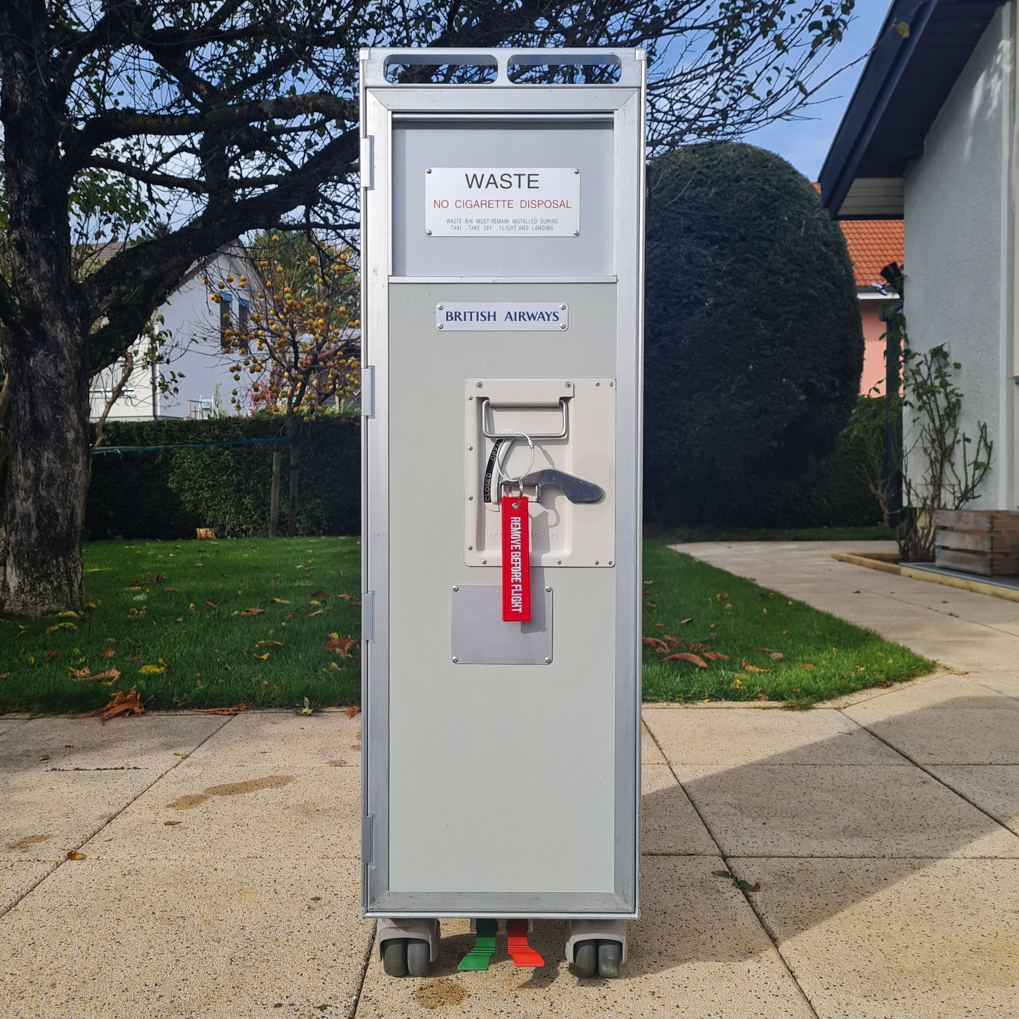 Wir bieten diesen toll erhaltenen Waste-Trolley in hellem Achatgrau an (RAL-Farbpalette 7038), der 2019 produziert worden ist und seither für British Airways unzählige Male um die Welt geflogen