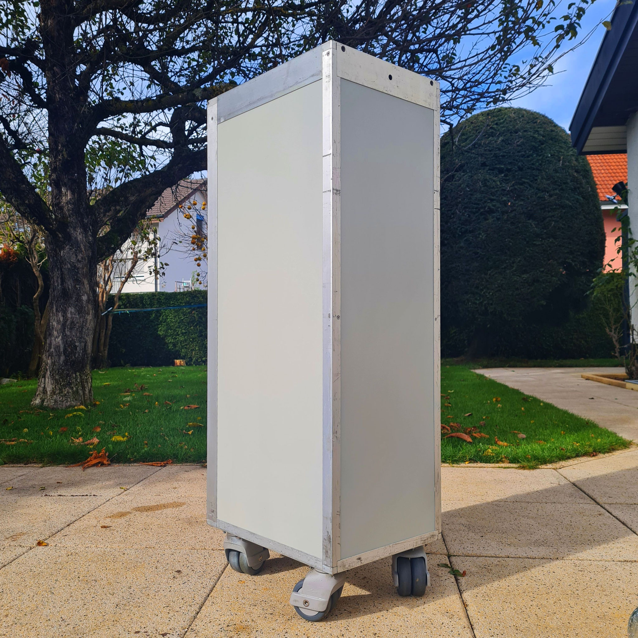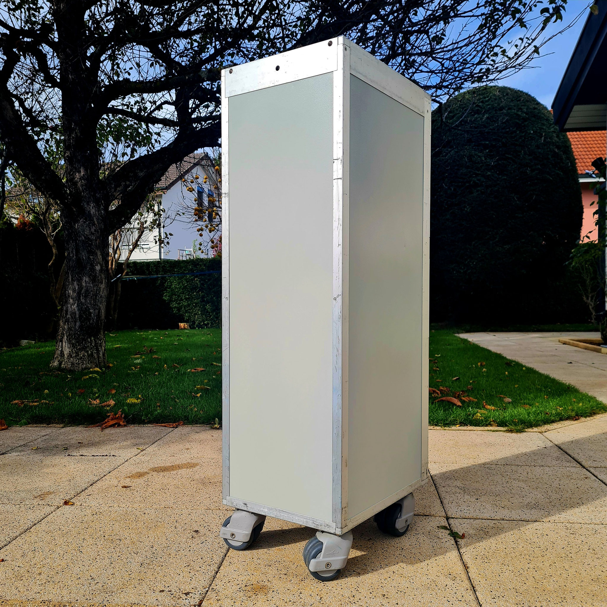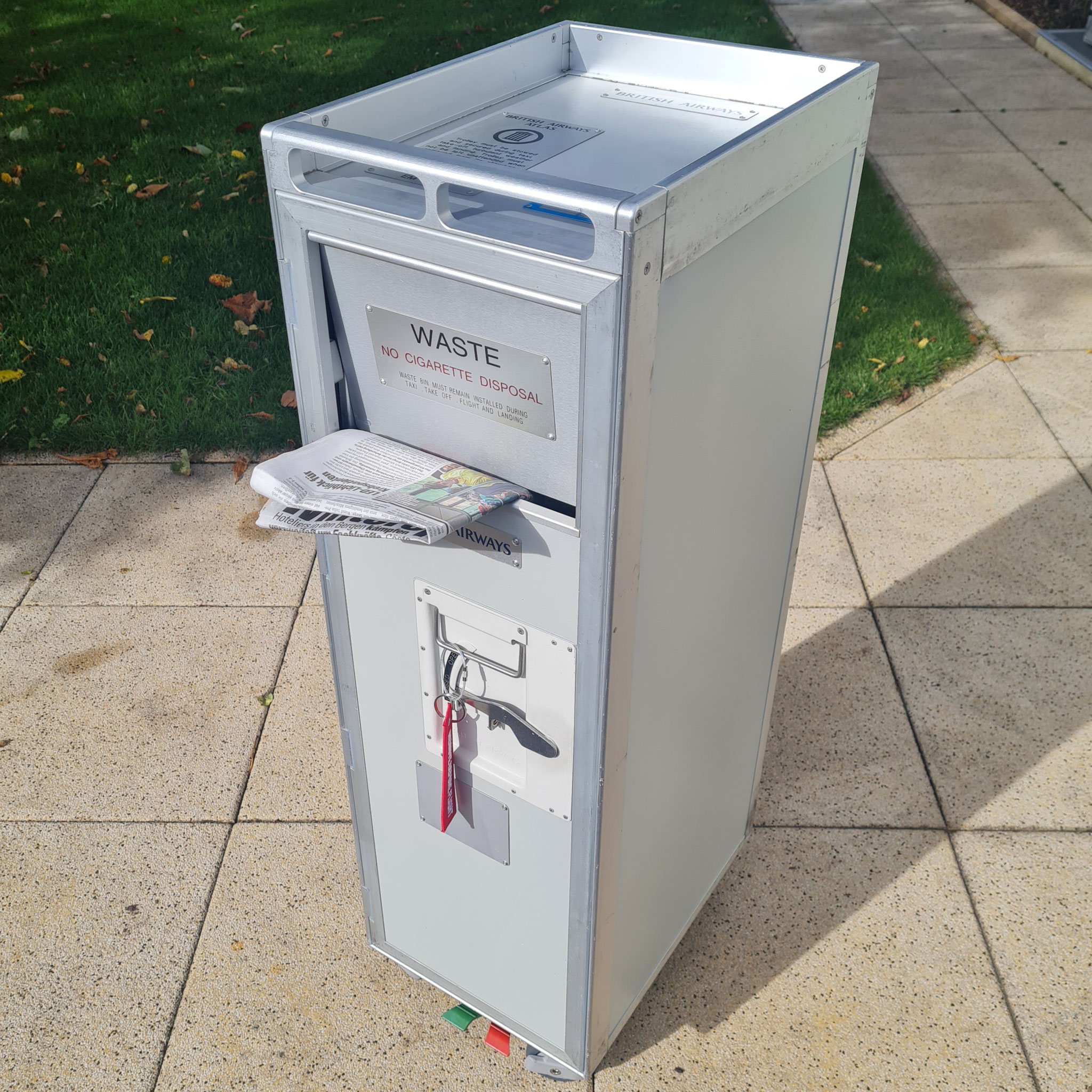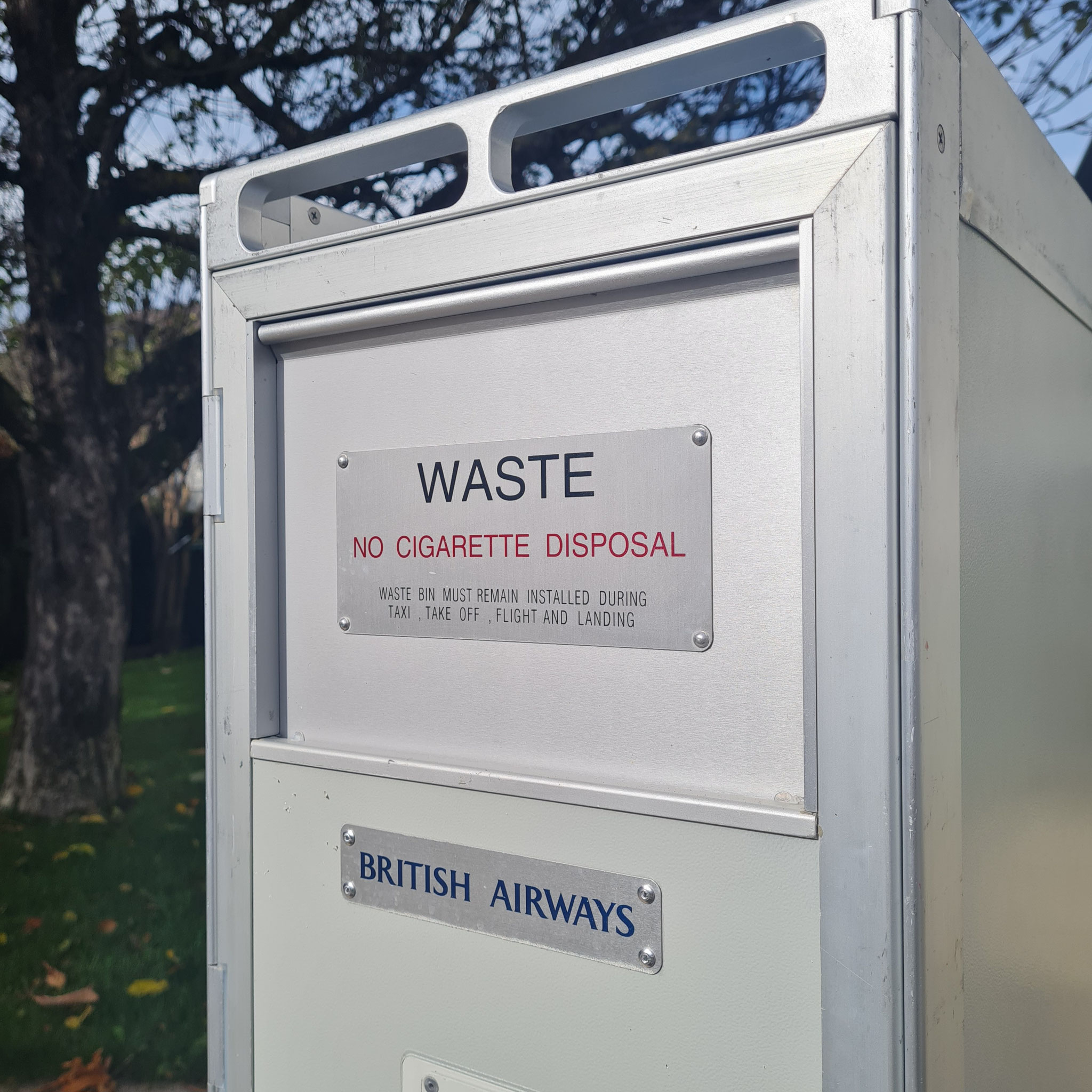 Wir bieten diesen toll erhaltenen Waste-Trolley in hellem Achatgrau an (RAL-Farbpalette 7038), der 2019 produziert worden ist und seither für British Airways unzählige Male um die Welt geflogen